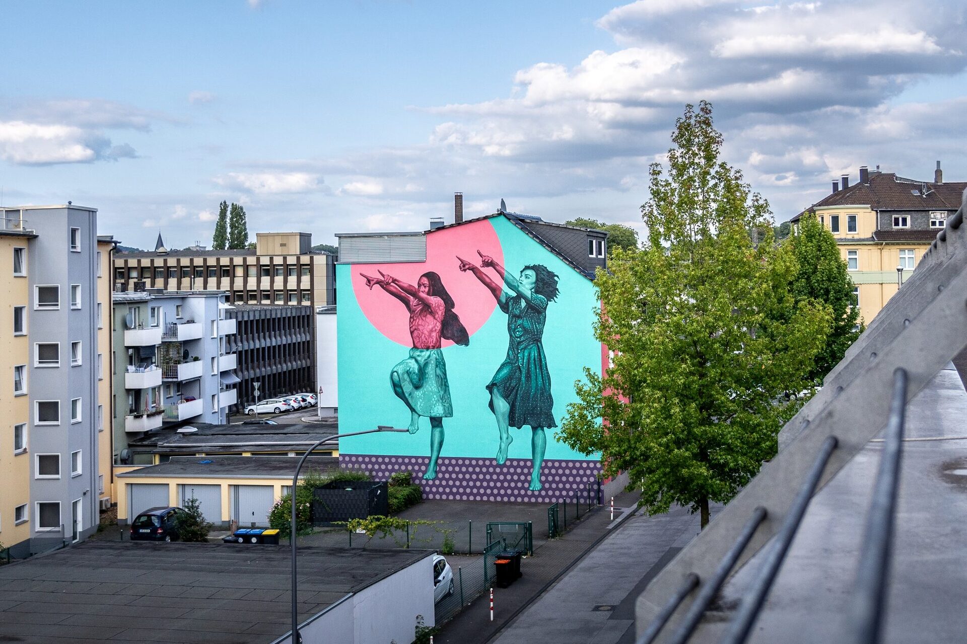 Unser Foto des Monats ist vom Dach des Visiodroms mit Teleobjektiv enstanden und kommt von Susanne Rauen. Susanne erläutert: "Wie man ja in meinem Instaprofil sehen kann, bin ich ein großer Fan der Murals in unserer Stadt - und auch von Pina Bausch. Beim Motiv THE WINDOW WASHER von Caratores fand ich schön, dass man es von diesem besonderen Aussichtspunkt sehen kann und das Wandbild ist - trotz der engen Bebauung in Heckinghausen - ein schöner Hingucker."