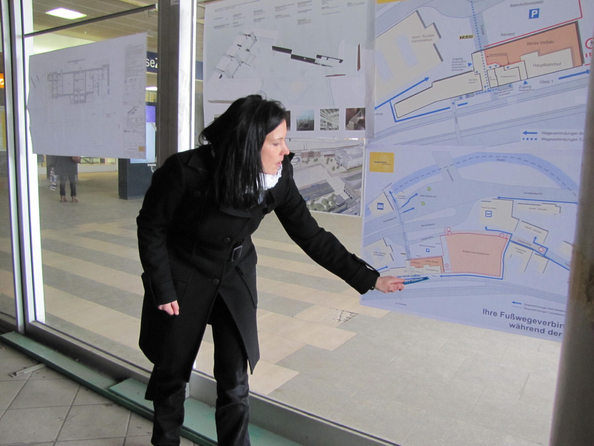 Der Flachdachanbau vor dem historischen Bahnhofsgebäude wird abgerissen und auf der gesperrten Straße Döppersberg geben Baumaschinen die Richtung an. Das erfordert eine Umleitung der Fußgängerwege. Projektleiterin Katja Schnell erläutert auf einer Pressekonferenz im Bahnhofsgebäude die Details.