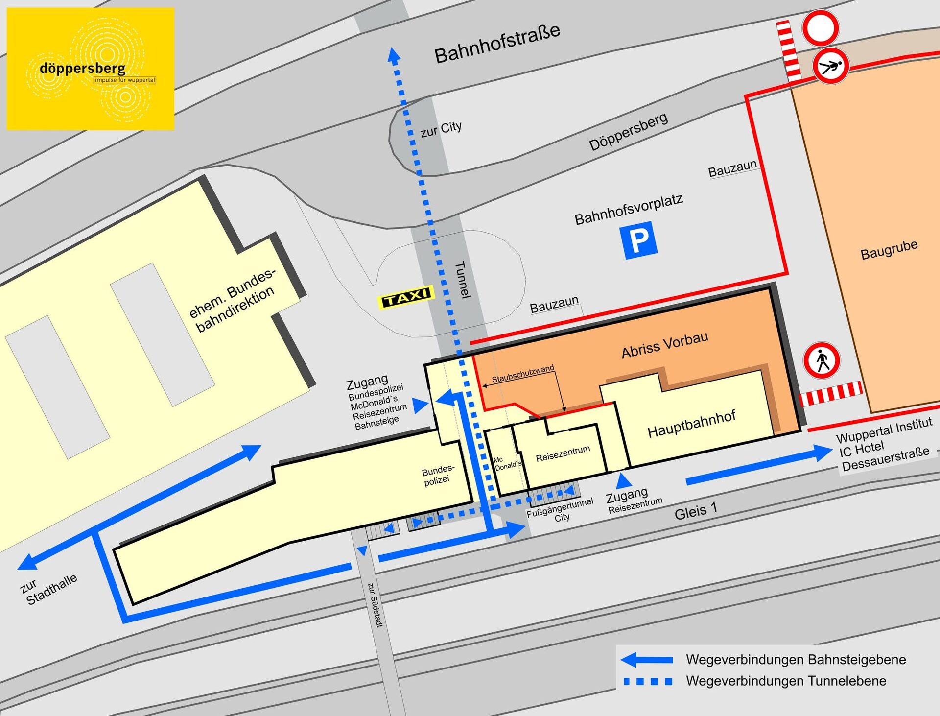 Mit dem Fortschritt der Arbeiten an der Straße Döppersberg wird in Kürze der Durchgang auch für Fußgänger gesperrt. Eine provisorische Rampe führt dann vor dem Wuppertal Institut an der Stützwand vorbei zu Gleis 1. Von dort gelangen die Passanten über die oben beschriebenen Wege auf den Vorplatz und über die Treppen auf dem Bahnsteig in den Tunnel und dann in die Innenstadt.
