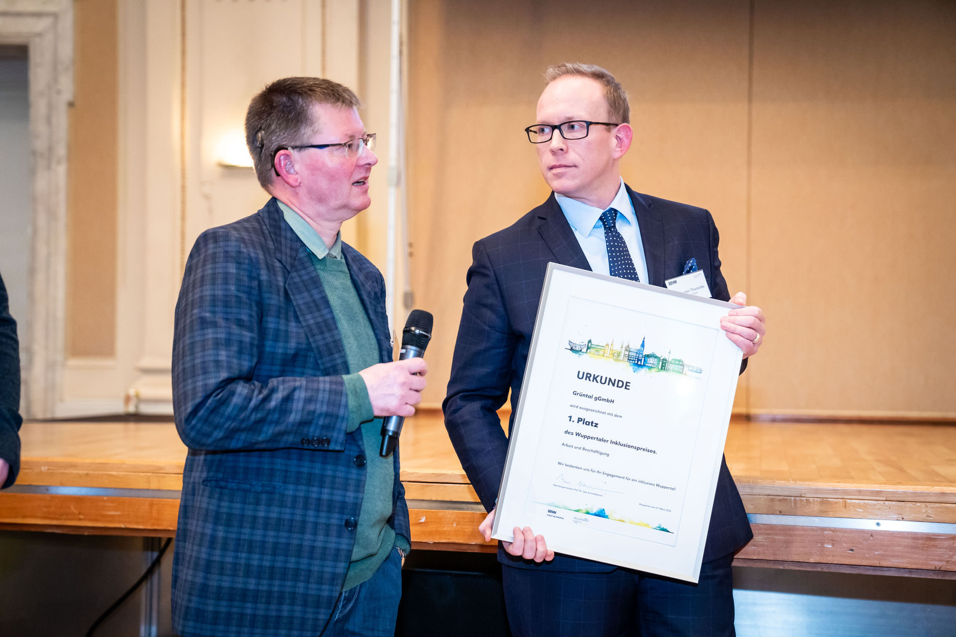 Die Grüntal, die erste Preisträgerin, setzte sich gegen die Konkurrenz von elf Mitbewerbende durch. Als Inklusionsunternehmen der GESA, das sich stets weiterentwickelt und das seit fast elf Jahren immer neue inklusive Arbeitsplätze schafft, begeisterte das Dienstleistungsunternehmen für einen umfangreichen Service rund um Haus und Garten die Jury. Bei der Grüntal arbeiten Menschen mit und ohne Behinderung ganz selbstverständlich zusammen, sodass jeder und jede seine jeweiligen Stärken bestmöglich im Team einbringen kann.