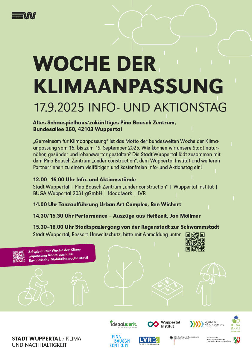 Gemeinsam mit dem Wuppertal Institut, dem Pina-Bausch-Zentrum „under construction“ und weiteren Partner*innen haben wir ein buntes Päckchen an Aktionen gepackt, die zum Nach- und Mitmachen anregen. Die Aktionswoche ist eine Initiative des Bundesministeriums für Umwelt, Klimaschutz, Naturschutz und nukleare Sicherheit (BMUKN) und wird vom Zentrum KlimaAnpassung durchgeführt.