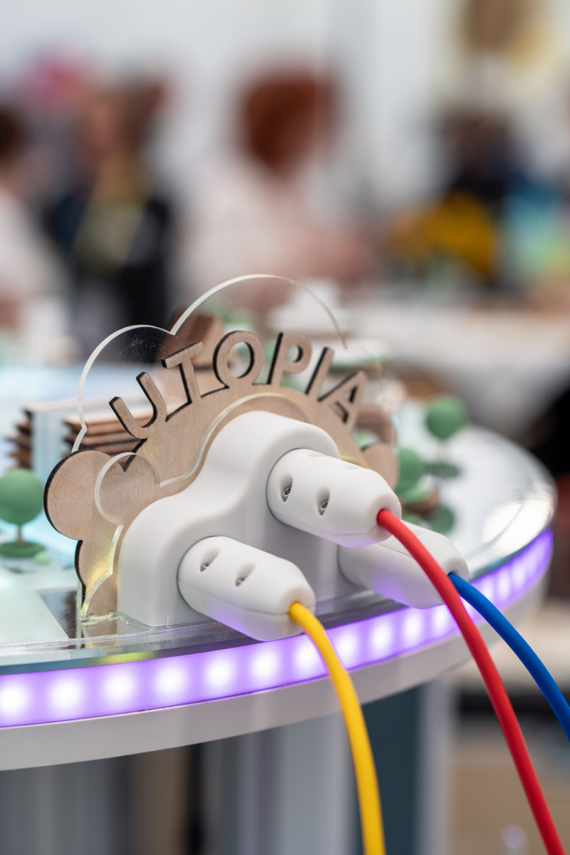 Das Exponat "Die Stadt der Zukunft" veranschaulicht die Transformation hin zu ressourcenleichten und lebenswerten Städten in den Bereichen Mobilität, Ressourcen, Kreislaufwirtschaft, Energie, Stadtwandel sowie Produktion und Konsum. Dabei werden unter dem Motto "Making Utopia Possible" über drei Modellebenen hinweg, die jeweils den gleichen Innenstadt-Ausschnitt zeigen, konkrete Lösungsansätze vermittelt und Synergieeffekte dargestellt. Über Kurzgeschichten lassen sich themenspezifische Inhalte vertiefen.